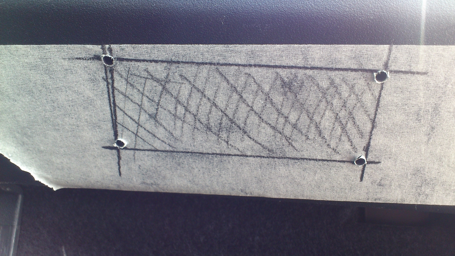 pour commencer un colle un morceau de scotch de carrossier sur la zone qui va accueillir le nouvel éclairage. puis on joue avec le mètre, le crayon, l'équerre, le rapporteur.... tous ce que vous voulez. l'important étant de tracer l'emplacement à découper ;-)