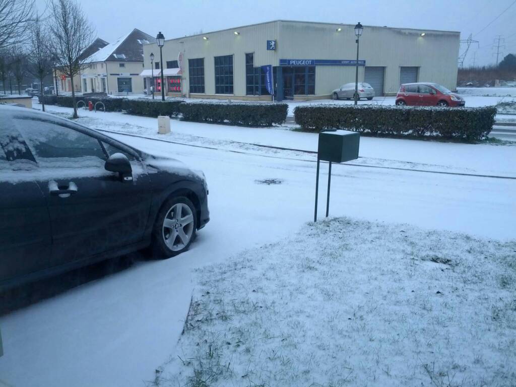 Il neige depuis 9H. Il fait -3°C et la neige commence a prendre sur les toits et les voitures.