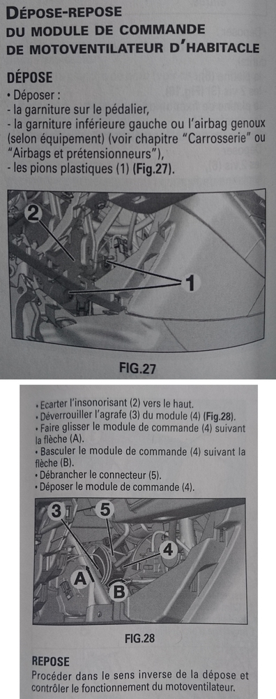 Ben voyons... Je suis au chomage et je dois me débrouiller par mes propres moyens. Le gars m'a quand même fait une fleur en me disant que la référence de la résistance du pulseur d'air correspondrait à 6441 AA. Mais c'est à vérifier... Pour ça j'ai besoin de démonter.