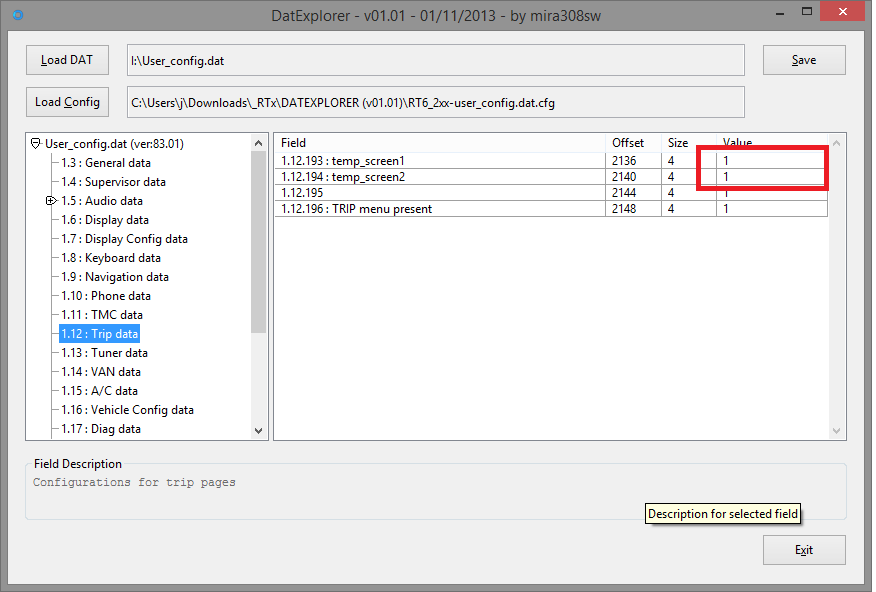 Naviguez jusqu'à la section Trip data et changez les valeurs 0 de la colonne value à 1 des lignes temp_screen1 et temp_screen2