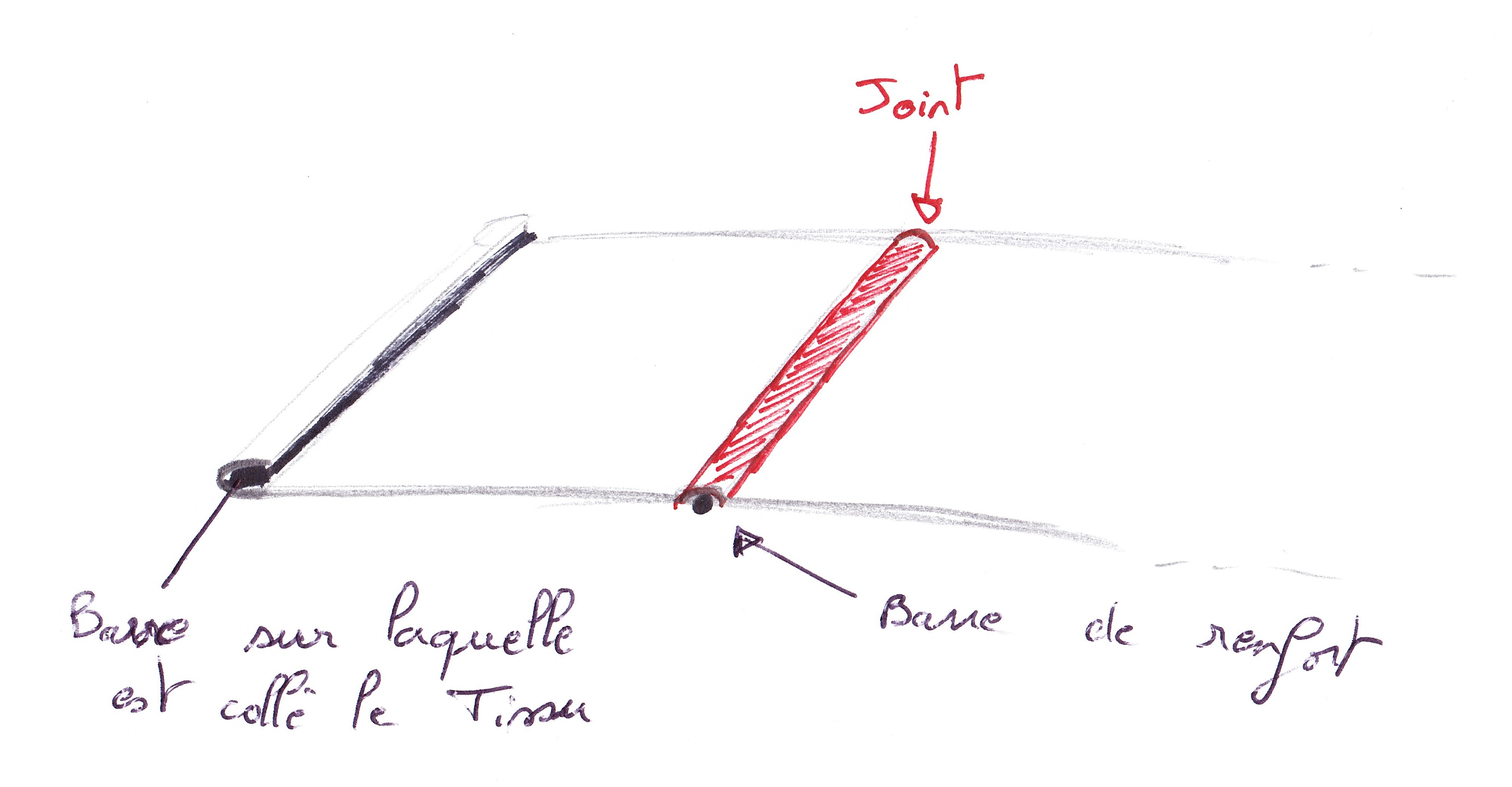 Je pense que ce que tu appelles joint (en bleu sur le croquis) est en fait un profilé anti-arrachement de la toile, c'est pourquoi je l'ai placé de la sorte car il me semble avoir vu un bossage sur la partie supérieure de la barre avant dans lequel il semble s'emboîter. N'hésite pas à mettre de la colle car ça semble être le point faible de ce montage !!!