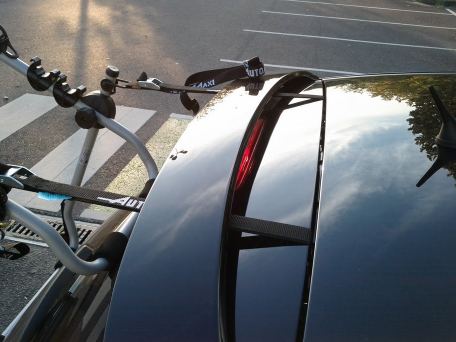 Je suis allé dans plusieurs magasins spécialisés automobiles, ils m'ont tous dit qu'il n'était pas possible de mettre de porte vélo hayon si celui-ci avait un becquet. Alors j'ai testé... :-)
