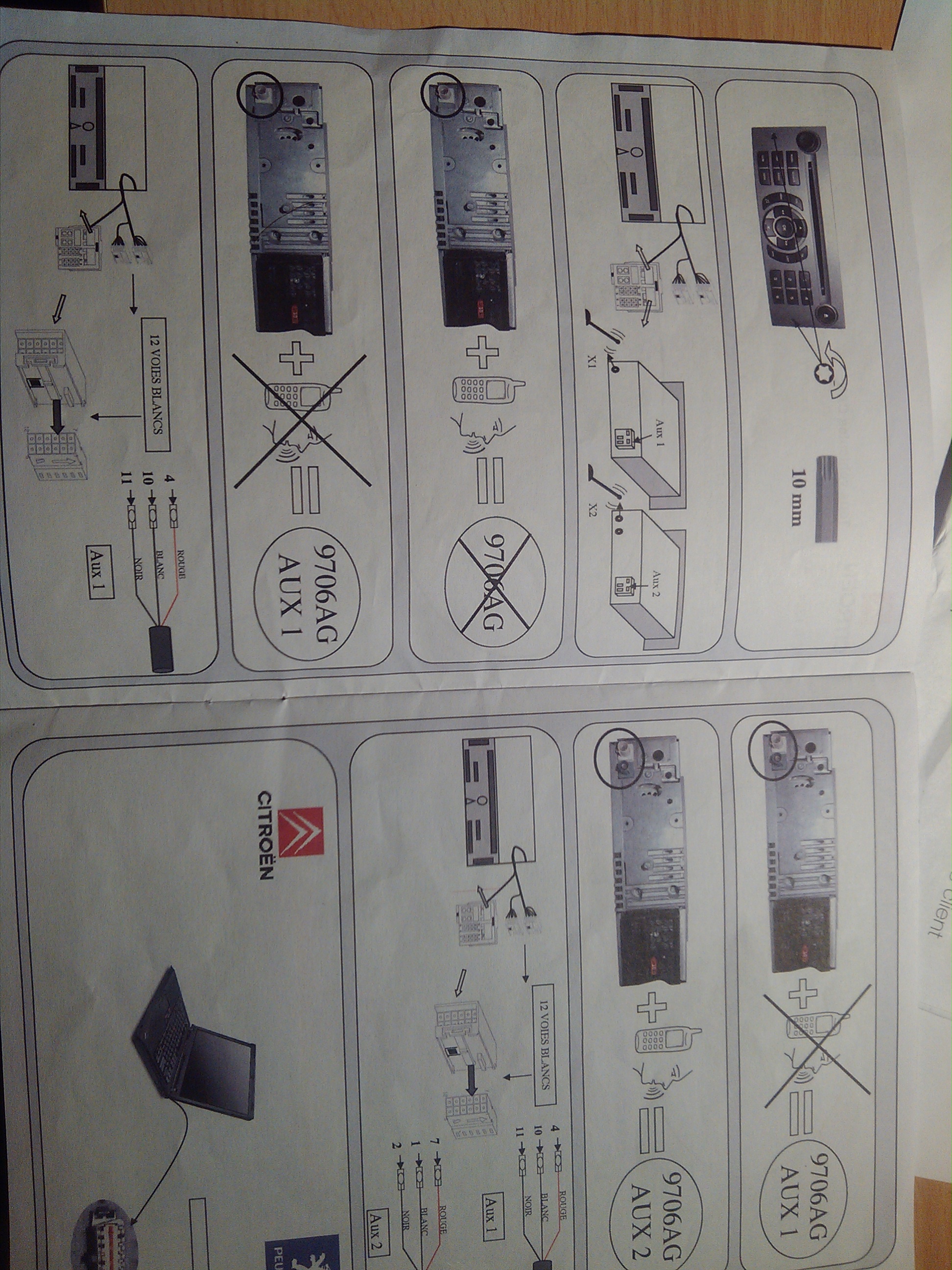 sur la connectique, blanche, de coté tu peux voir qu'il y a un second connecteur qui clipsé à l'intérieur, mais je pense que le document est très explicite avec les N° de fils et ceux qu'il faut laisser (enfin ceux qui correspondent à l'aux)