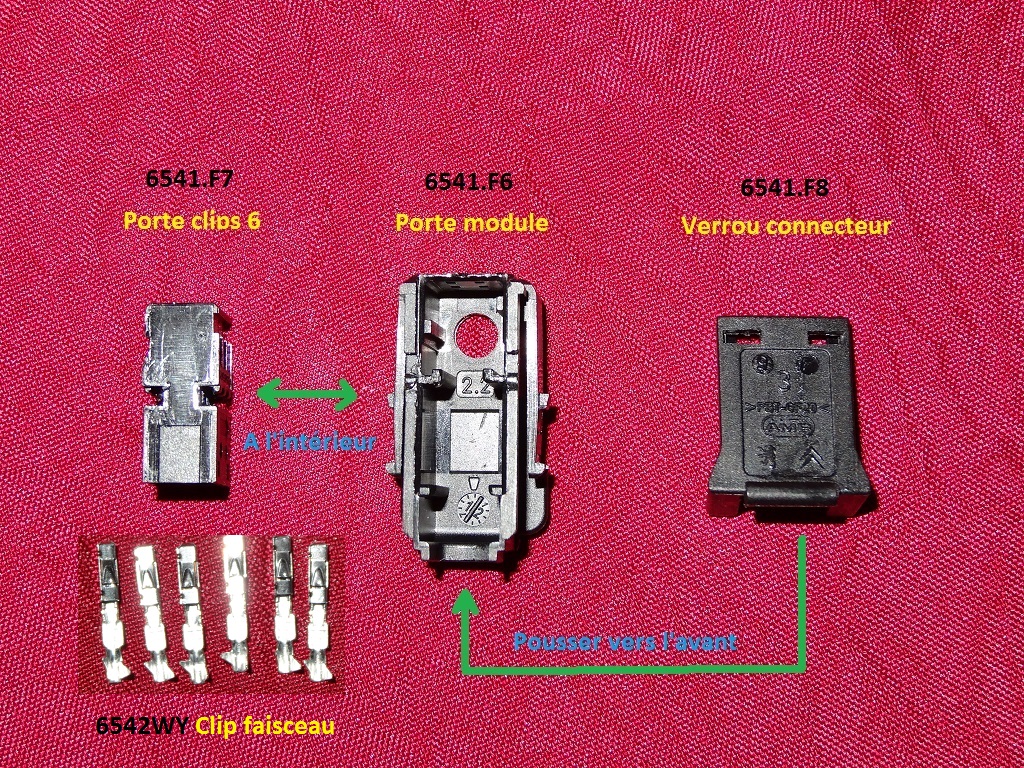 réf : 6541.F6 Porte module, réf : 6541.F7 Porte clips 6, réf : 6542WY Clip faisceau, réf : 6541.F8 Verrou connecteur