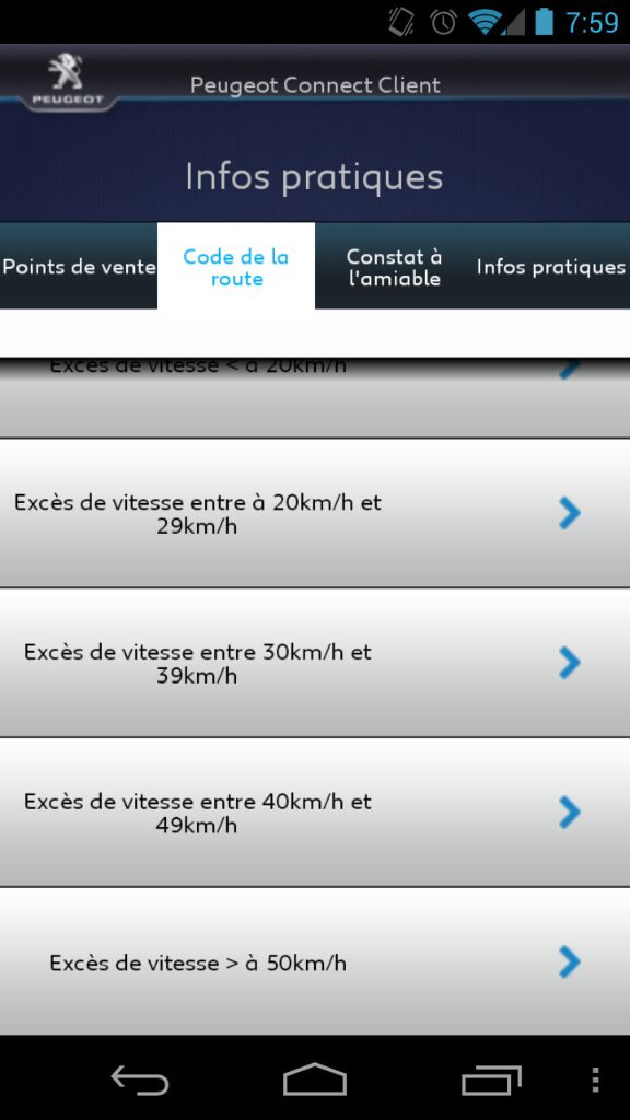 - l'appli regorge de pleins d'informations, dont le changement des ampoules, la batterie, les points perdus par infraction (vitesse, parking), un bouton pour appeler directement le garage, Peugeot assistance, et bientôt un système d'écoconduite, mais pour l'instant pas activé/présent dans l'appli (4Mo).