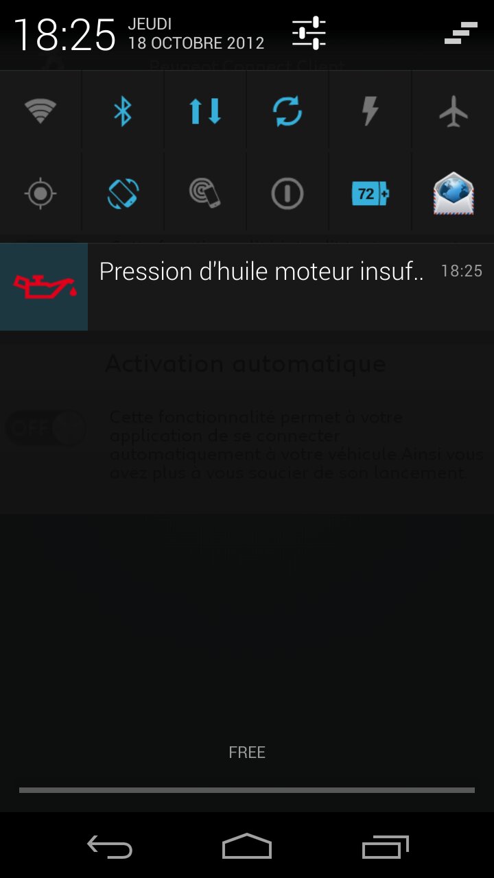- la connexion sera automatique, l'application active le bluetooth automatiquement sur le téléphone (option désactivable) et ensuite télécharge tout seul les données. Après le pairage, premier message d'erreur : pression d"huile, arrêter le véhicule ! au final, la voiture de la veille avait déjà le soucis, et donc il faut que je laisse comme ça... soit. Peut-être un vrai pb ou un faux pb, ils ont remonté au centre le pb...