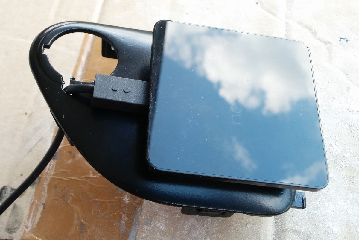 Le but de la modification d'aujourd'hui a été de mettre en place mon chargeur Qi de Nexus 5 que j'ai eu à son achat. L'avantage de ce chargeur est qu'il permet de recharger (sans dec') le téléphone simplement en le posant dessus, rien à brancher, ça fonctionne par induction pour ceux qui ne connaîtraient pas cette technologie. Il faut bien sur que le téléphone soit compatible avec ce type de chargement. Et le chargeur Nexus est également aimanté ce qui permet de maintenir le téléphone en place en roulant, un gros +. Voilà le chargeur :