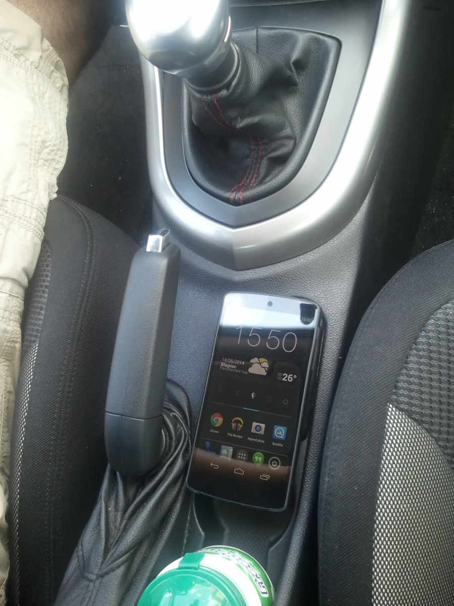 Oui il tient bien parce qu'il est aimanté, même en mettant à la verticale ça tient. Je reviens de le tester, c'est bien pratique. Je rentre, je mets le bluetooth, je le pose et je balance la musique, et en avant simone. En plus il est bien à portée de main ici, par contre il faut quitter la route des yeux pour le toucher, mais au pire je le prends en main puis je le repose, bien pratique. Me suis bricolé ça notamment parce que le Nexus 5 n'a pas une super autonomie, surtout avec bluetooth et cie.