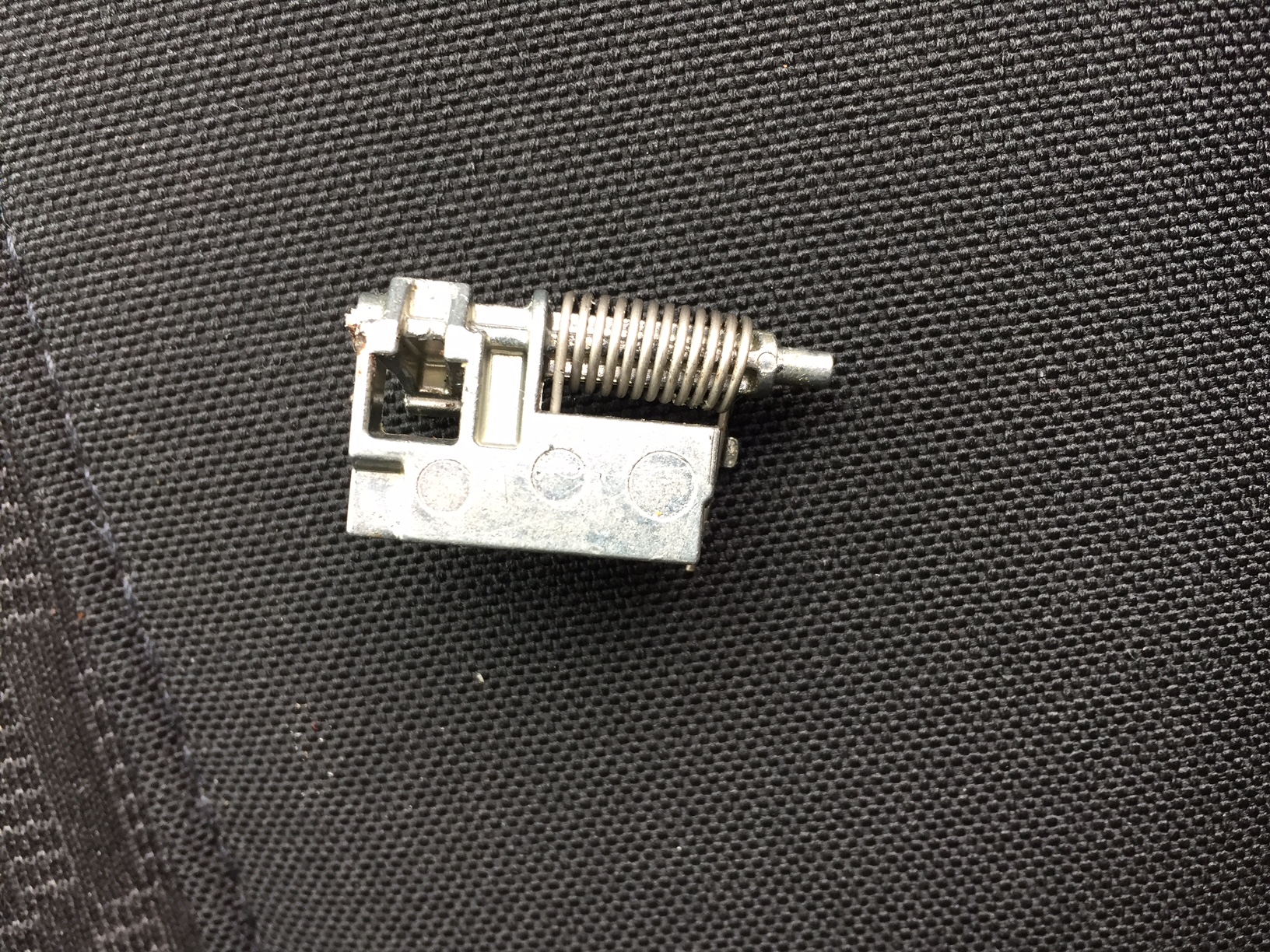 - je vois (ou plutôt j’appercois étant donné le peu d’ouvertures) qu’il y a un gros ressort servant probablement de rappel de la poignée, et à sa gauche un autre ressort plus petit rattaché à une pièce métallique. Je pense que ce dernier est cassé et que la pièce à laquelle il est rattaché bloque le mécanisme de la poignée.