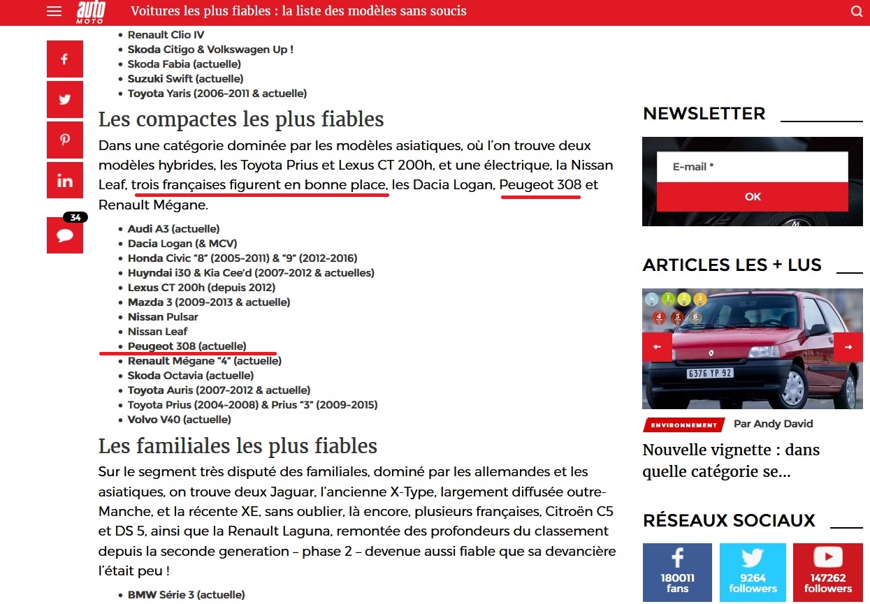 Pareil pour l'A3 chez les compactes; ya jamais eu de soucis sur les tdi et les boites dsg, jamais ! Et chez les familiales, ils parlent de l'ancienne X-Type; on parle des diesel issus de la banque d'organes Ford, tdci bien connu sur la Mondéo II, peu fiables (je sais, j'en ai eu 2, le 115 et le 155) et chers d'entretien ... Bref, un classement où apparait notre 308, tant mieux, mais j'attends de voir quand elle aura 150000, voir si tout a bien tenu; pour l'instant, rien à dire, pas de merde; mais elle n'a que 3 ans et 95000 kms ! je commence à entendre des cuicui dans le tdb et j'ai une enceinte qui merde ... Mais ce 1,6 blue-HDI est des plus fiables, je le reconnais, j'ai acheté cette voiture pour cela (et pour coffre de la SW, plat jusqu'aux sièges AV, contrairement à beaucoup de break ...