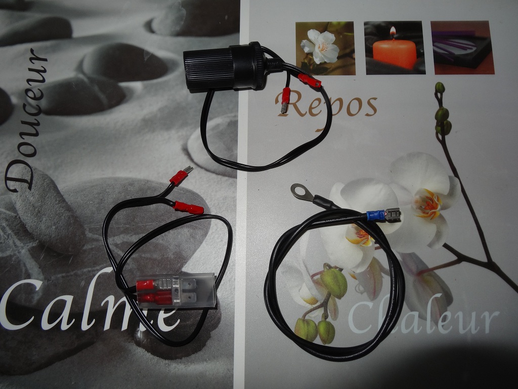 La prise allume-cigare femelle, l'adaptateur isolé à cosses 6.35, le câble de masse.