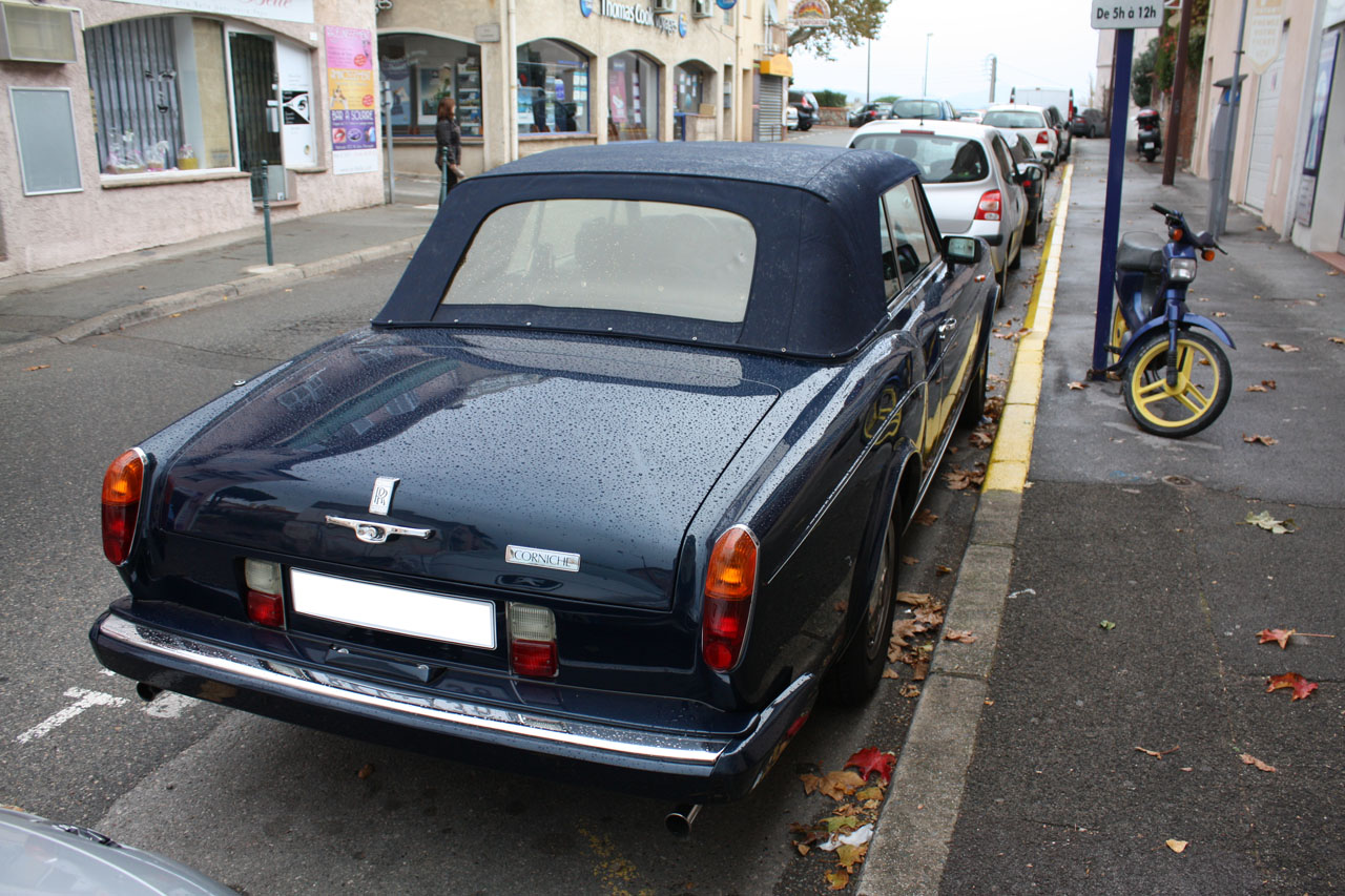 Comme vous pouvez le voir, c'est une "Corniche", modèle créé en 1971, une variante coupé-cabriolet de la "Silver Shadow". Je pense qu'il s'agit d'une "Corniche III", à partir de 1989. Celle-ci est dans un état impeccable. Le nom "Corniche" vient de la corniche de la Côte d'Azur très prisée de la (riche) clientèle anglaise (et internationale ensuite bien sûr).