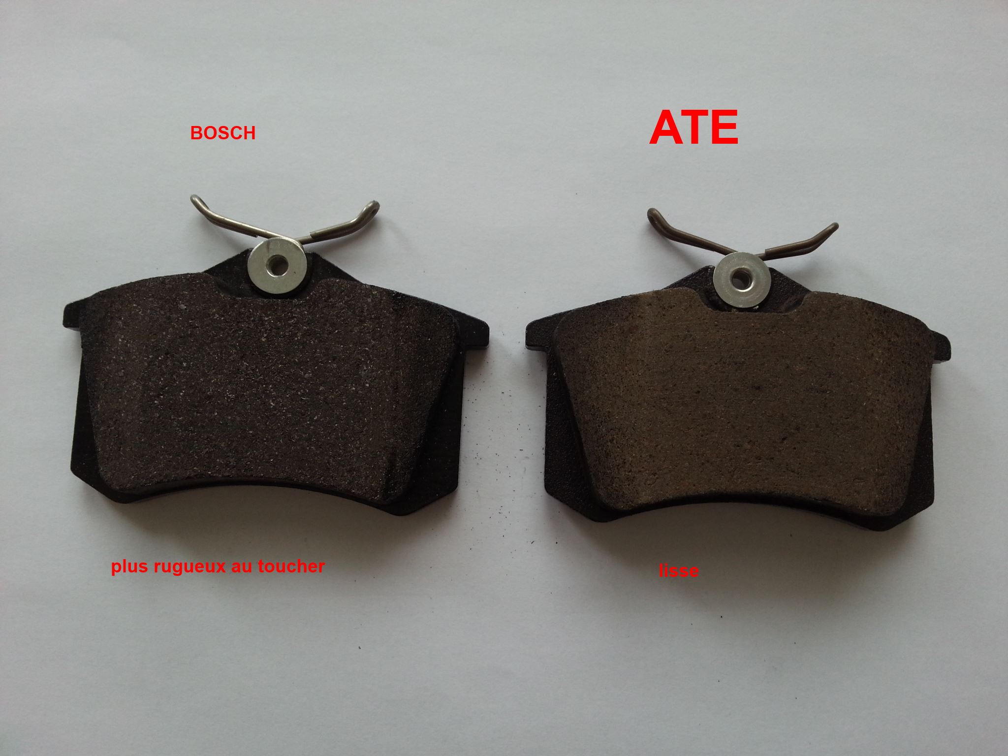 Neufs, ça freine moyen, voir très moyen. Les choses s'arrangent très vite une fois quelques freinages effectués : le revêtement du disque part et ne s'accumule pas sur les plaquettes grâce au rainures.