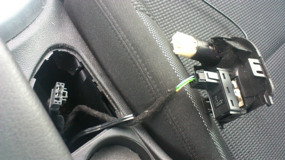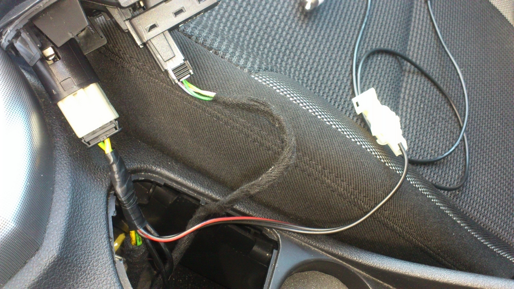 comme je n'ai pas réussi à faire passer le câble qui va à la sirène depuis le seuil de porte jusque sous le siège, je l'ai fait passé le long de la console centrale, sous le volant pour arrivé à hauteur de la boite à fusible où le câble est actuellement en attente