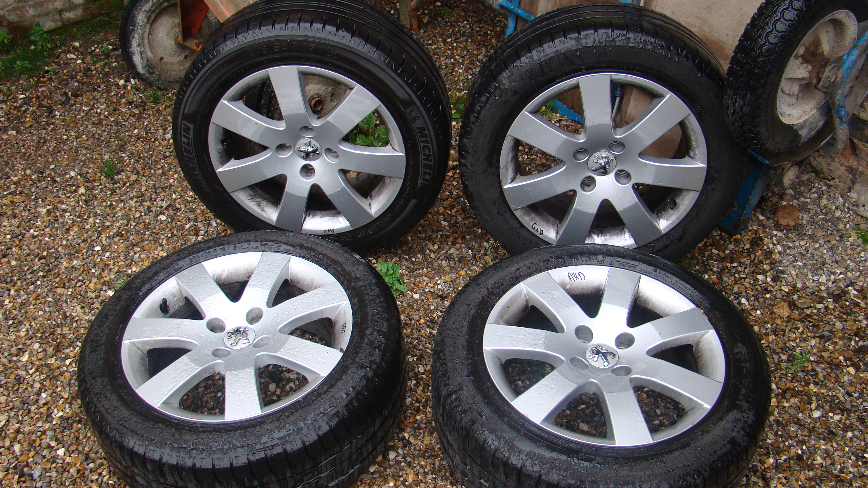je vends mes jantes Alu 16" pour 308, avec pneus encore bon montés Michelin 205x55x16.