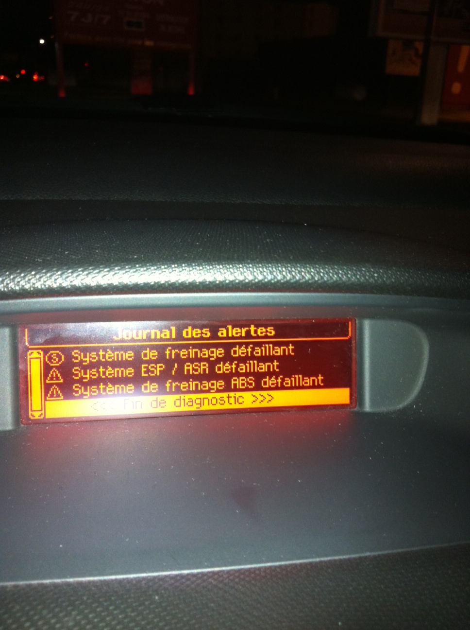 Samedi 23h30, je suis à la pompe à essence, tout va bien. Quand je remonte dans la voiture, les essuie-glace se mettent en route (tout doucement), et la voiture ne démarre plus avec un message : "antidémarrage électronique défaillant". Je réessaye, un autre message s'affiche (en plus du premier) : "système de freinage défaillant", avec voyant STOP allumé. J'ai pris une photo de ce qui était affiché :