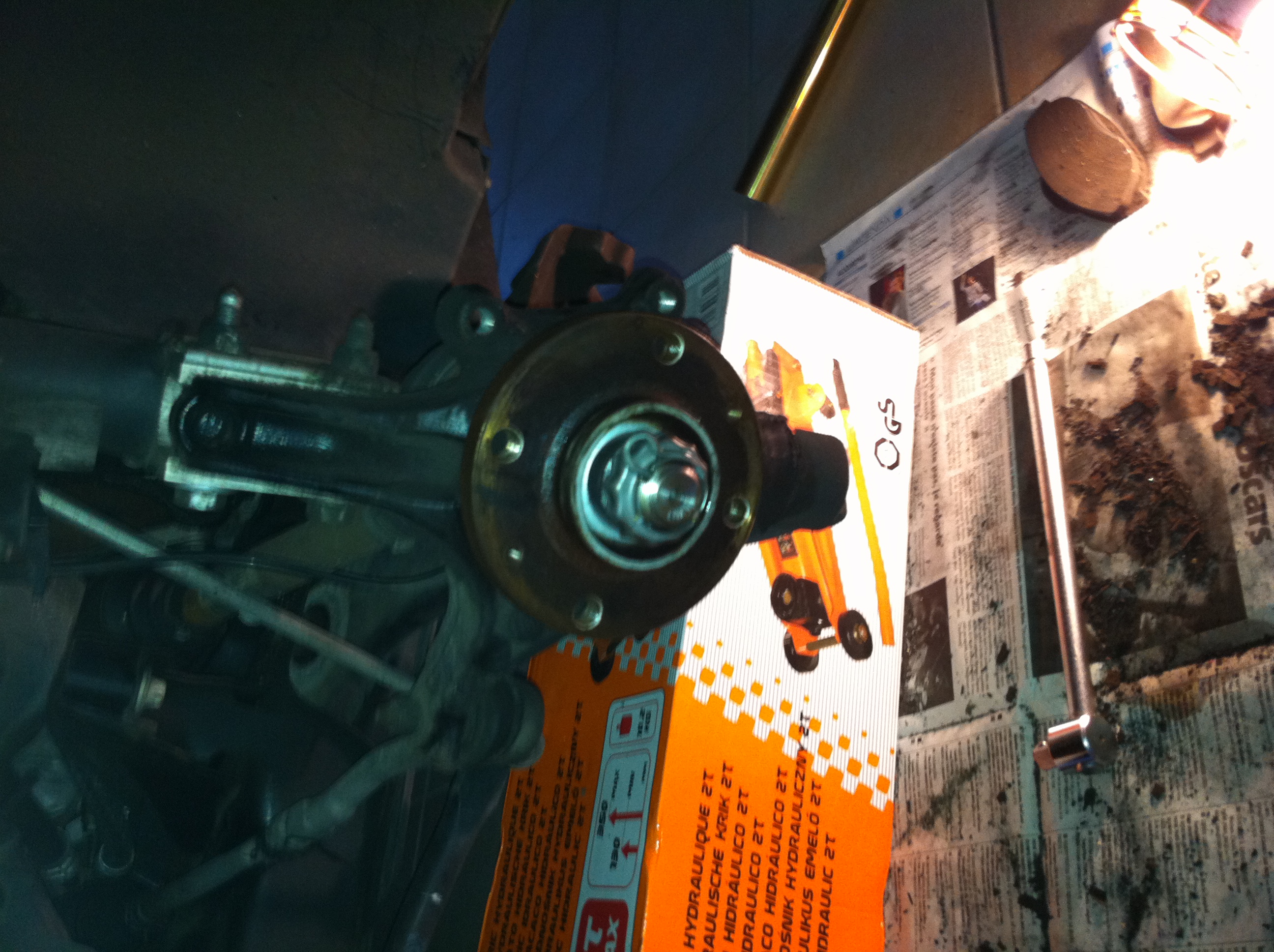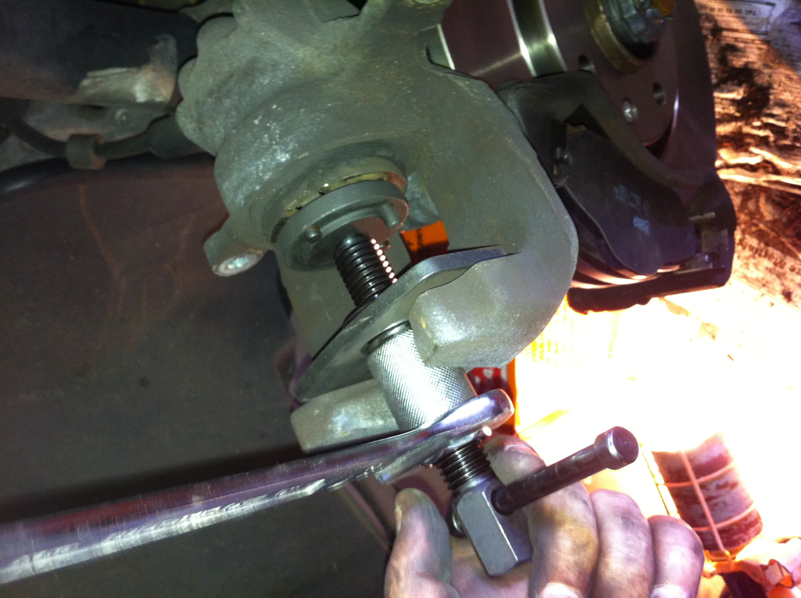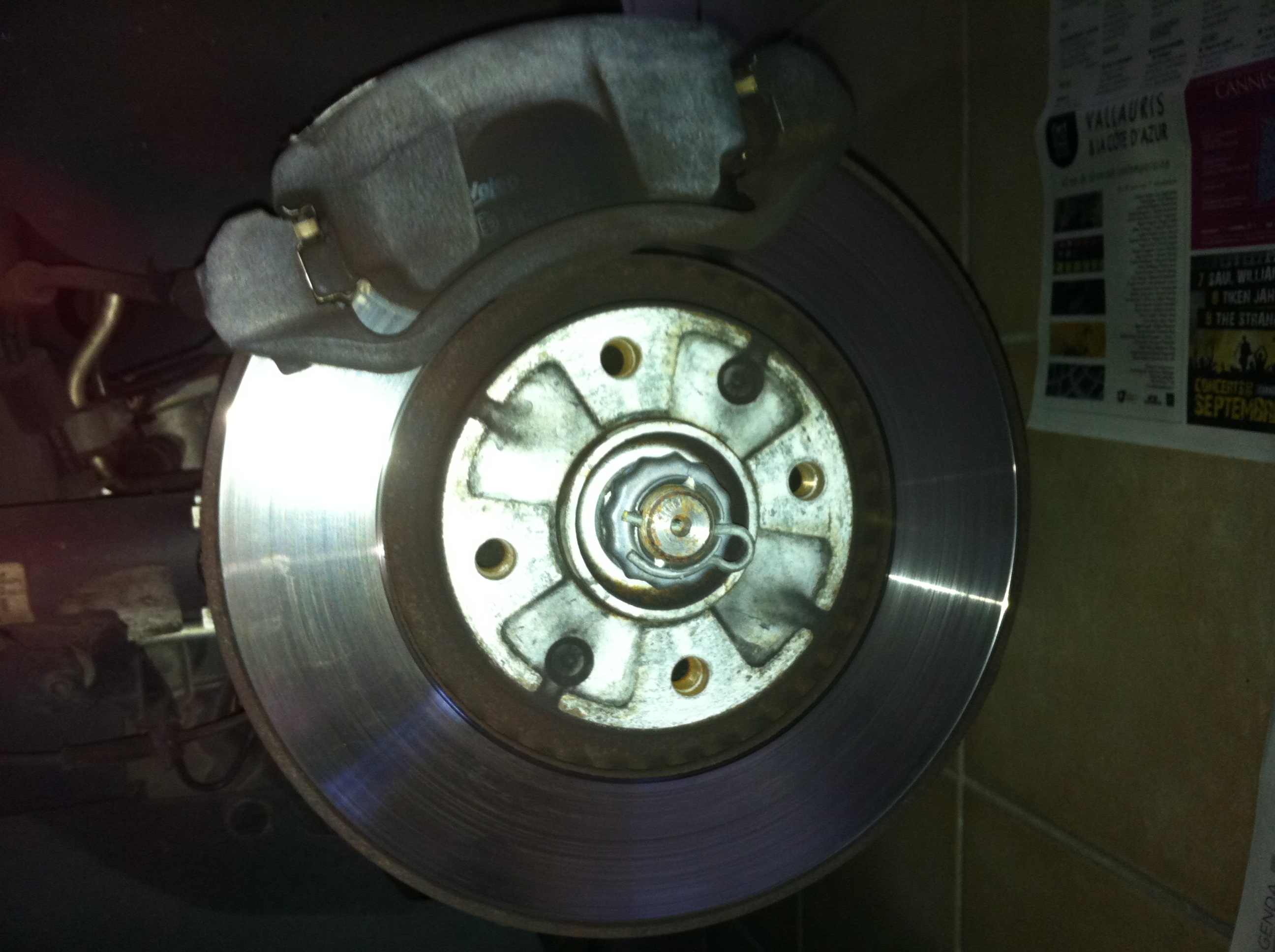 Deux bon coup de massette pour décoller les disques... Le seul hic, c'est la grosse clé Torx de 55 pour démonter les étrier de freins... Merci à l'agent Pigo à côté de chez moi qui a bien voulu me le prêter.