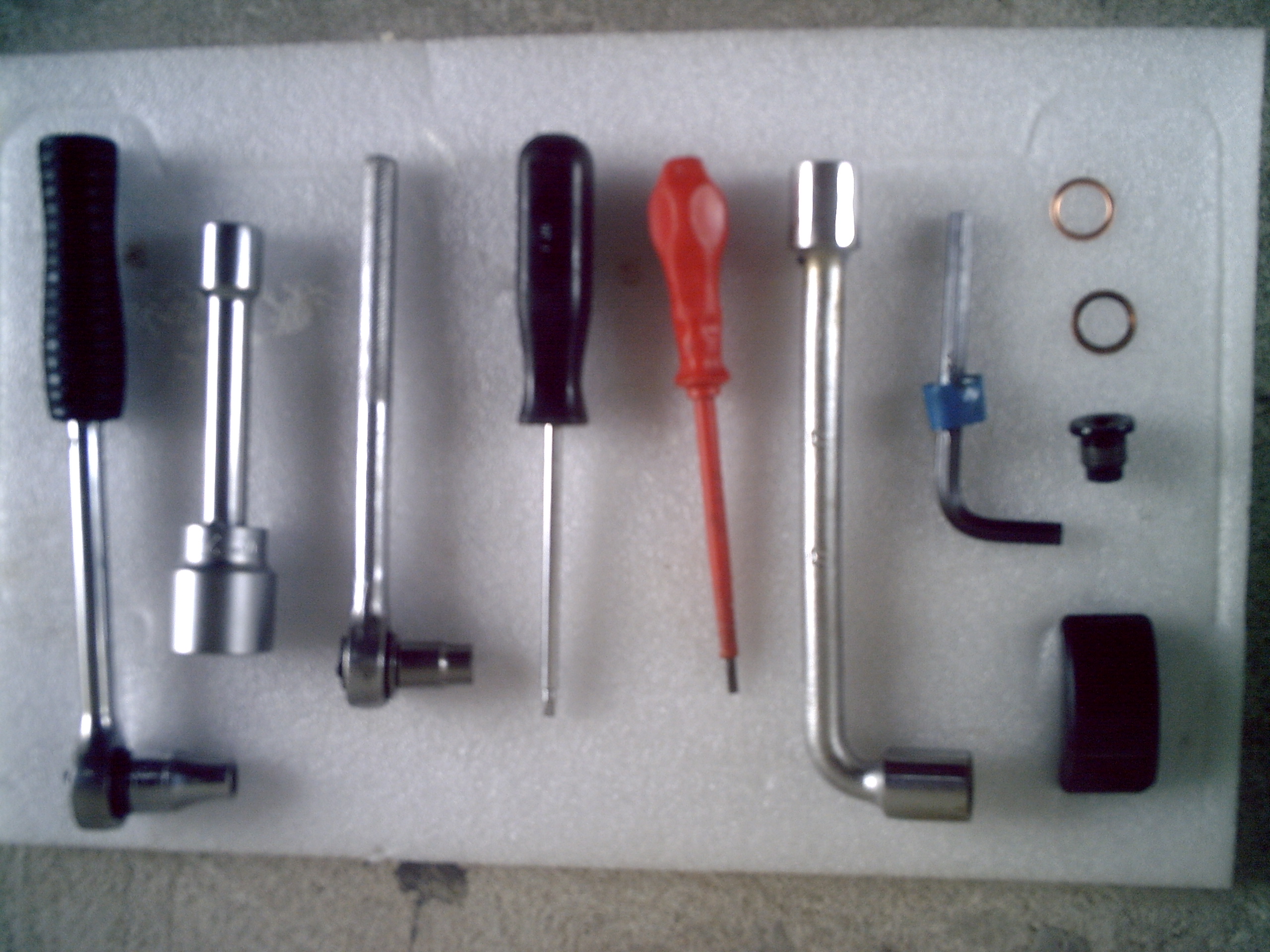 Le matériel nécessaire : la seringue à huile pour le résidu d'huile dans le corps de filtre, l'aimant pour récupérer le bouchon quand il vous échappe dans la bassine d'huile noire (beuark !!!), le trio cliquet+prolongateur+douille de 28 pour la cloche de filtre à huile, le petit cliquet et le Torx pour le couvercle de filtre à air, la clé Allen pour le bouchon de vidange (du 8 ou 10, ne sais plus).