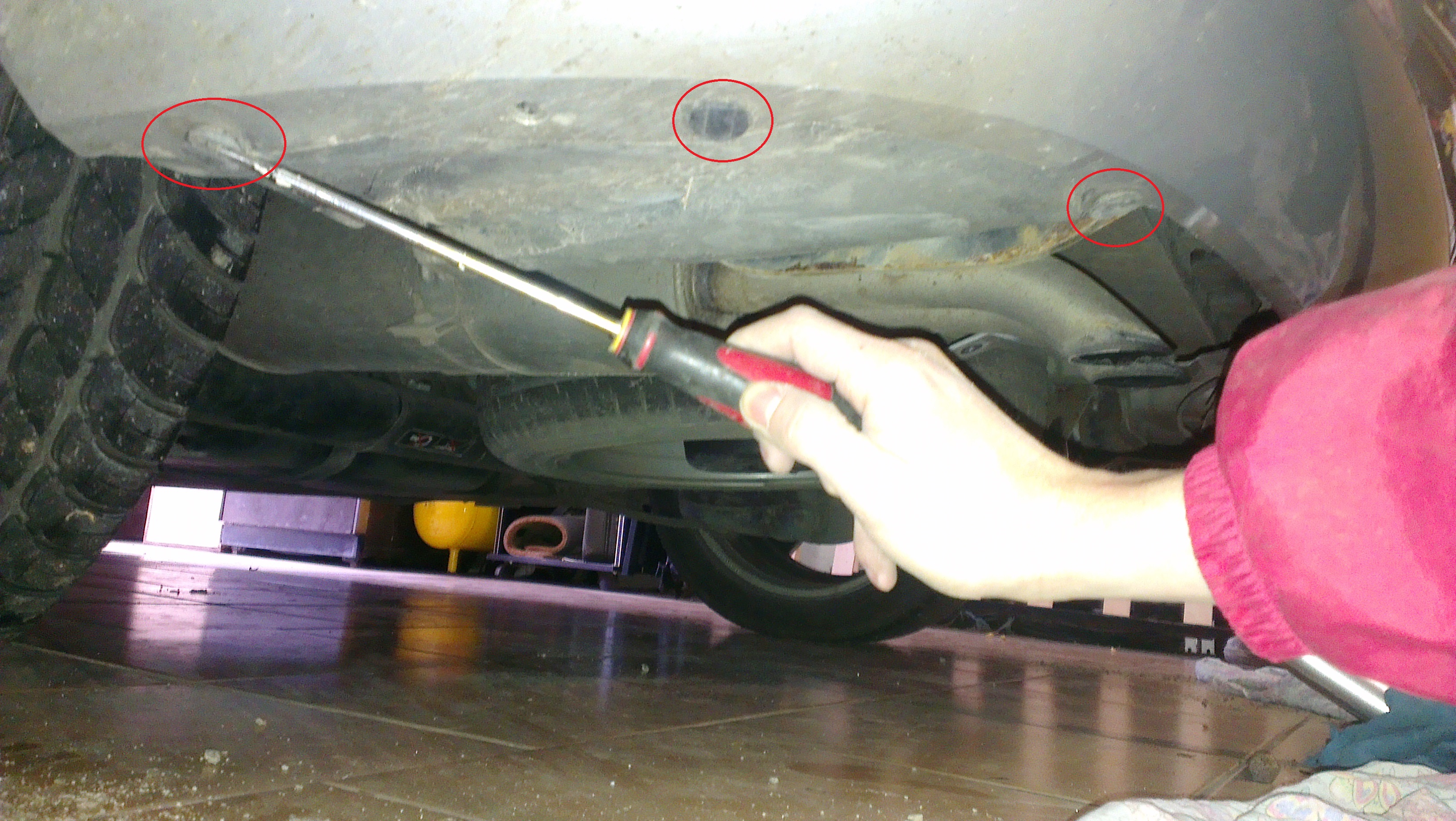 Sous la voiture à l’arrière il y a trois attaches à faire sauter à l’aide du tournevis.
