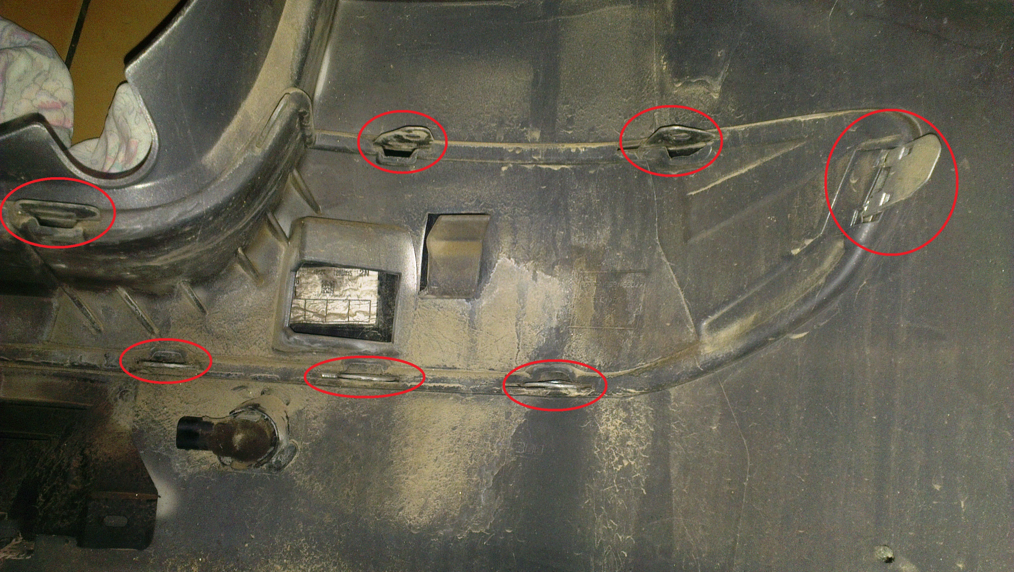 Avec le pare-choc posé au sol, on a plus facilement accès aux attaches des bandeaux que voici :