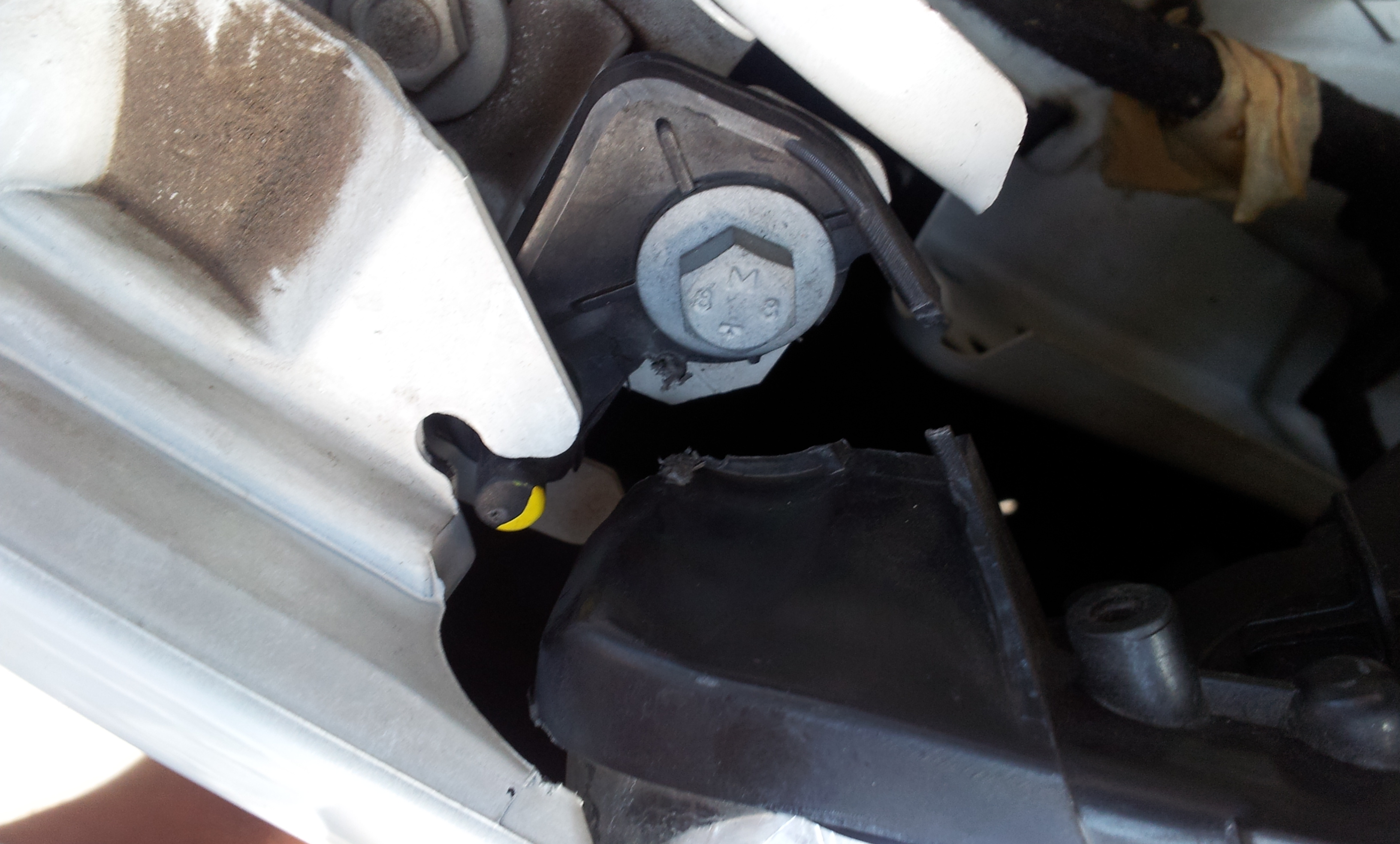 - ceci étant fait, on peut éventuellement se faire un peu de place en plus en dévissant la fixation du haut du phare, clé de 10 ou 12, puis en tirant un peu vers soi avec précaution de sorte à juste déboîter le petit ergot de positionnement qui se trouve juste à côté. On gagne 1 à 2 cm de passage