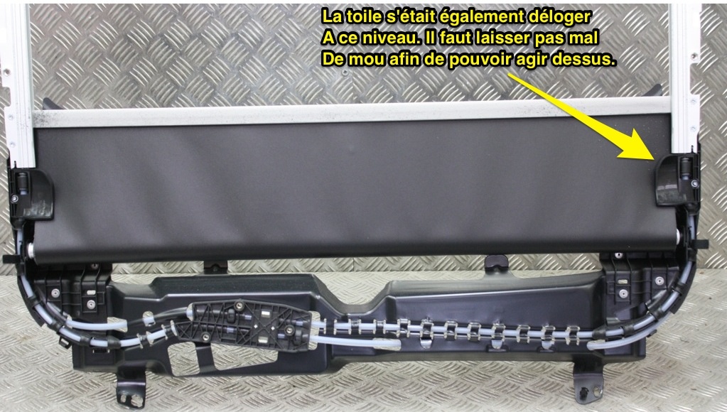 Le rideaux en tirant dessus et en le lachant il se recale gentillement a sa place. Il doit y avoir un systeme de rappel qui fait que le rideaux s'enroule. Cela doit aussi je le pense, dans le principe, servire de tendeur. Car c'est un rideaux souple et non pas les plaquettes de 3 morceaux que l'on retrouve assez souvent dans les vehicules equipé de toit pano.
