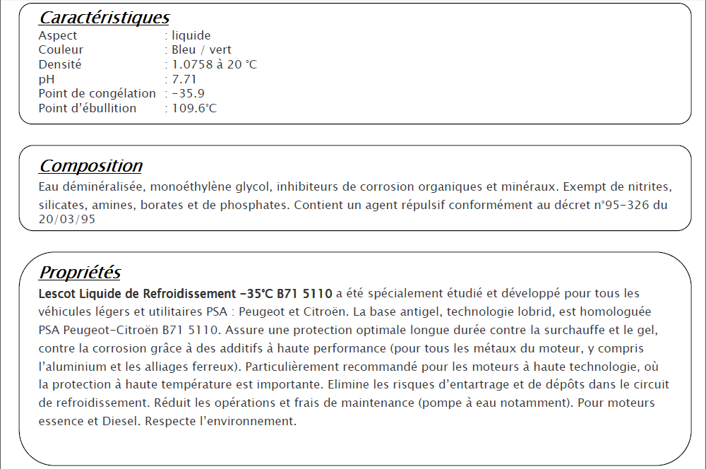 Un extrait du document Lescot concernant le liquide de refroidissement Peugeot à la norme B715110 :D