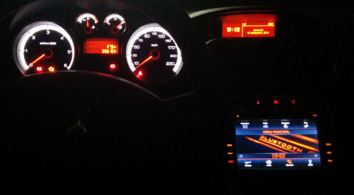 Juste pour vous dire que je viens de changer l'interface de mon 2-DIN grâce aux skins créés par un moddeur, KoTiX. Je tiens à le féliciter pour le travail de dingue qu'il a fourni, et pour le support qu'il m'a apporté pour que j'arrive enfin à le faire fonctionner complètement, ça a été un peu galère. J'ai le choix entre le skin d'origine, un autre légèrement modifié, un skin bleu et puis un rouge. Je peux passer de l'un à l'autre en moins de 10 secondes, au grès de mes envies, c'est plutôt cool.