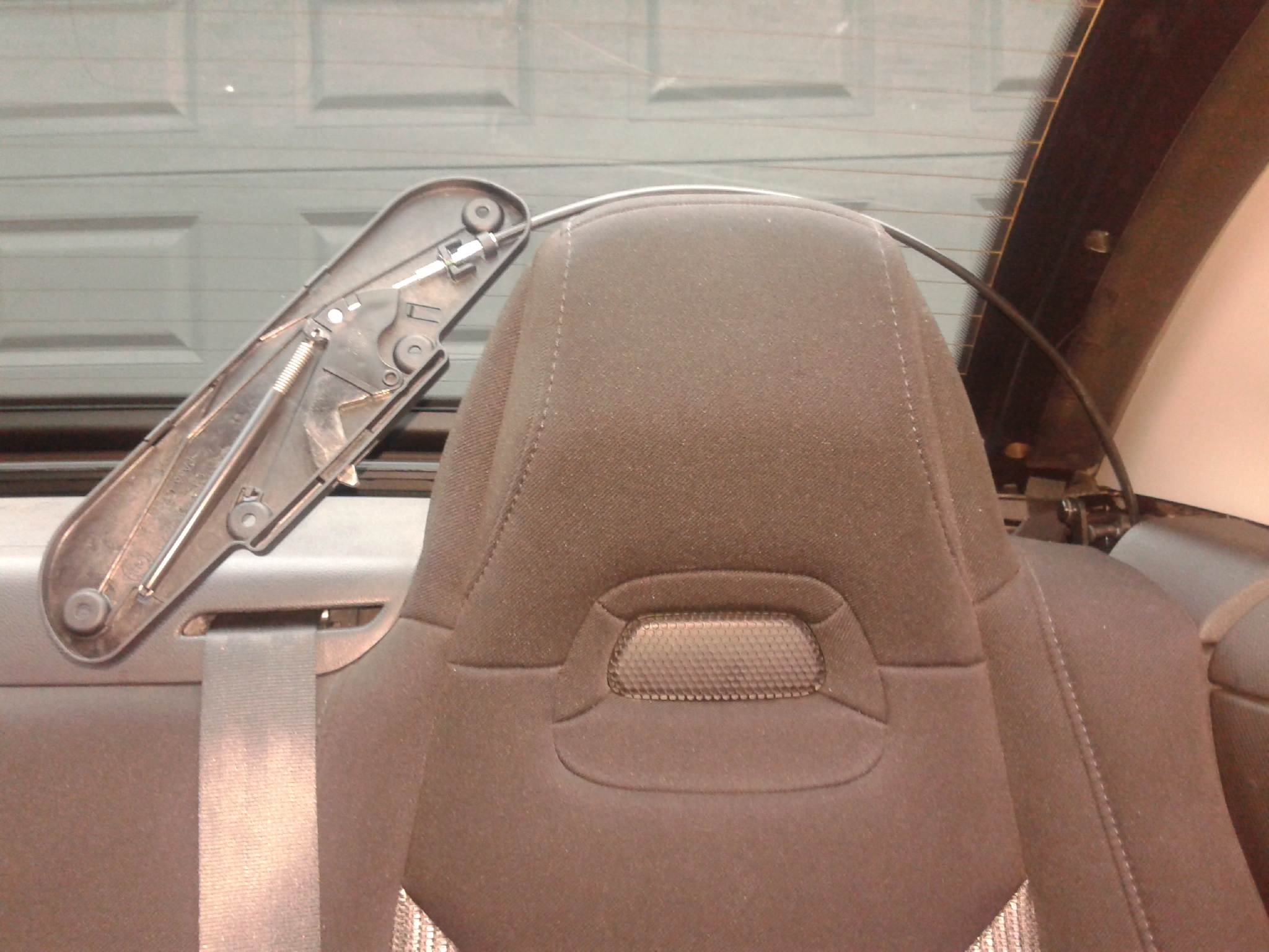 Si je ne me trompe pas, c'est un câble tendeur qui déclare au système escamotable lorsque la procédure de décapotage ou recapotage est terminée dans un sens ou dans l'autre. Par exemple, quand tu recapote, le toit se referme, et lorsqu'il est presque refermé, tout le système se tend pour rigidifier le tout. Je pense que ce câble sert donc à indiquer au moteur de toit quand sceller la procédure.