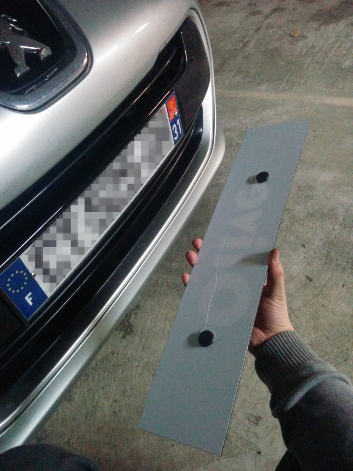 Petit test de pose des cache plaque, en utilisant des aimants. 1 collé derrière la plaque et un collé derrière le cache, ça fonctionne mais les aimants sont pas hyper puissants, faut pas rouler avec les caches quoi :hehe: