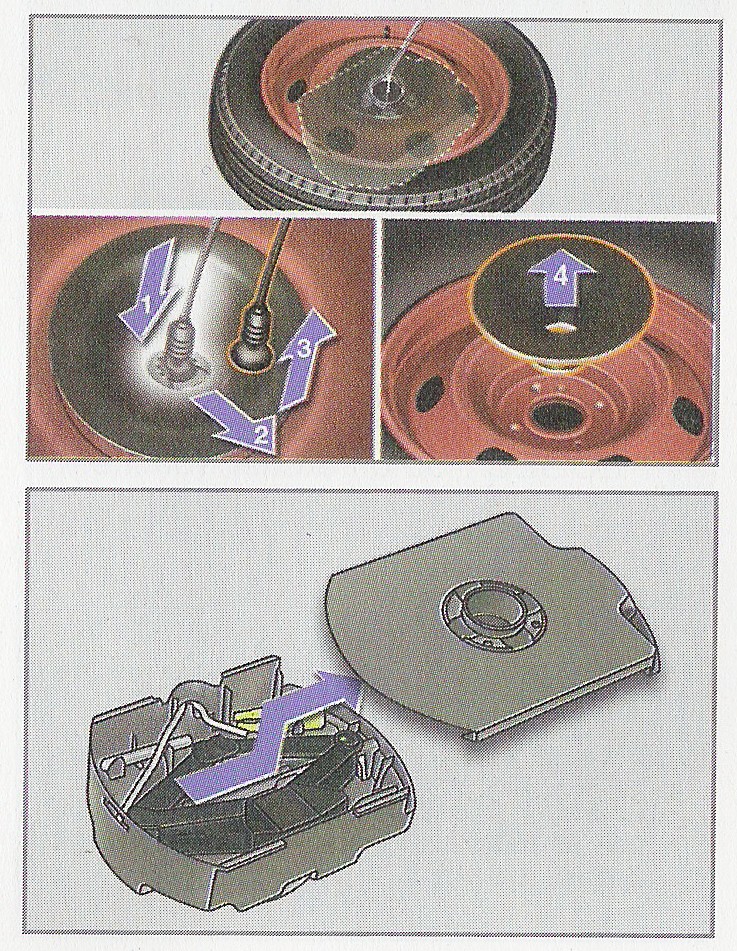 Voila l'été dernier en vacances, en vérifiant les pneus de la voiture j'ai voulu voir comment changer une roue en cas de besoin on ne sait jamais... (en général ce genre d'aventure se passe de nuit, sous la pluie, par grand froid, au bord d'une nationale... bref choisissez le cas que vous voulez ou n'importe quelle combinaison de cas !). Donc je descends la galette avec la clé qui actionne le filin depuis le coffre. Je tire la roue de dessous et là je constate qu'il n'y a aucun kit qui d'après le manuel devrait contenir dans une boite : "clé, cric, démonte cabochon".